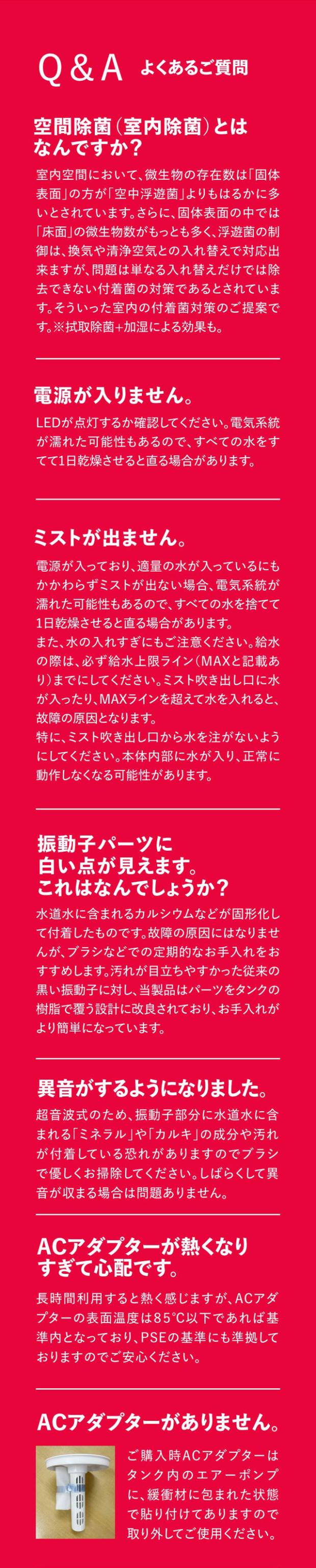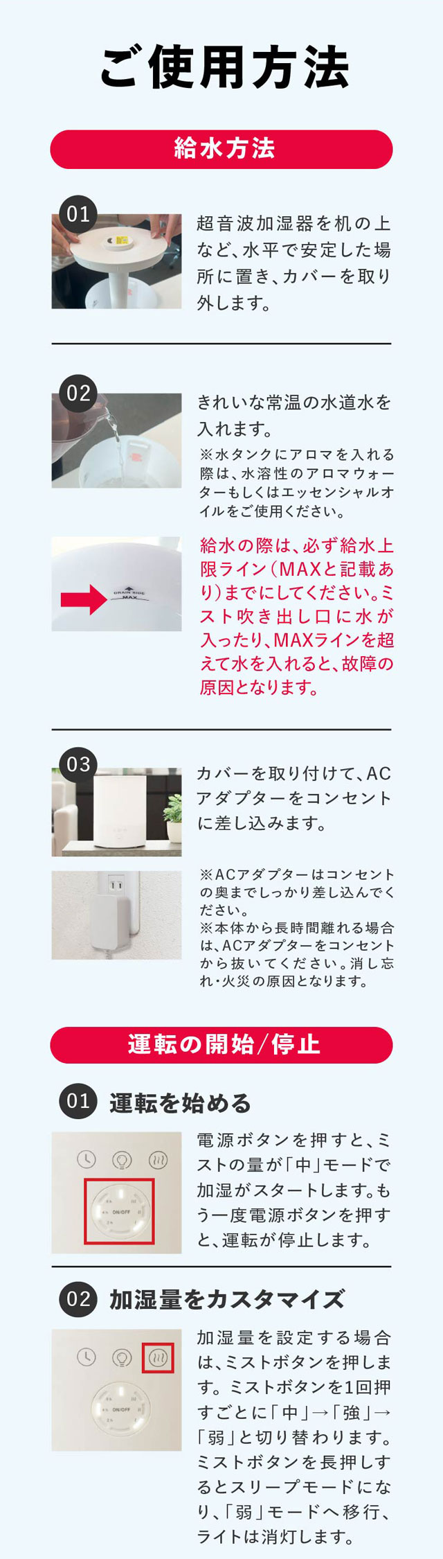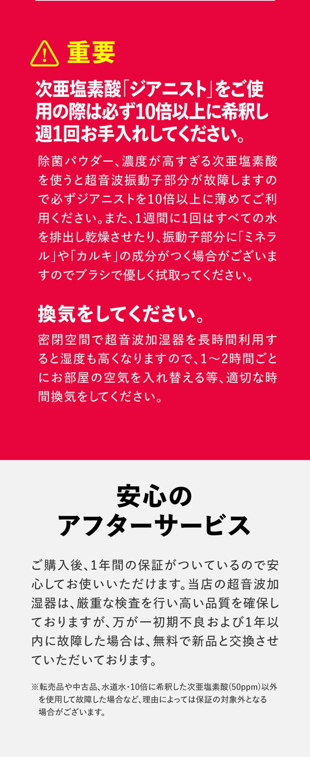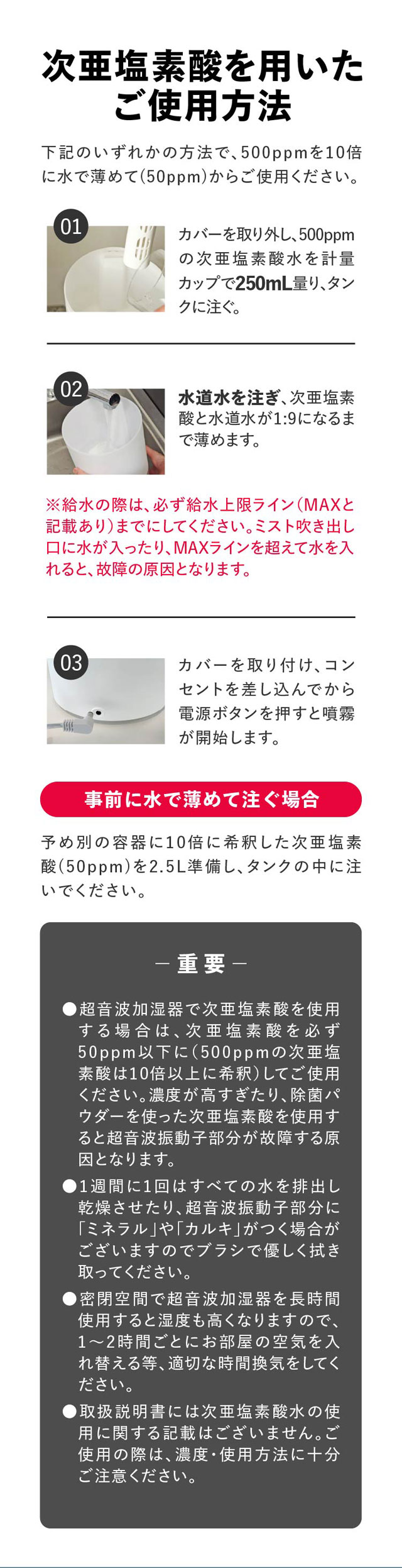 | 使用上の注意 | ●アロマオイルと次亜塩素酸の併用はしないでください。併用すると故障の原因になります。 ●アロマ加湿器としてご利用する際はお部屋全体に香りが広がりますので、ペット、赤ちゃん、妊婦さん、高血圧の方がいるご家庭では使用しないで下さい。 ●運転中や給水時は傾けたりしないでください。 ●水道水や次亜塩素酸に含まれるミネラル成分が超音波振動子に付着すると異音が発生致します。噴霧後しばらくして異音が収まる場合は正常ですが振動子部分のお手入れをお願い致します。(取扱説明書「5.お手入れのしかた」参照) ●排水やお手入れを行う際は、必ず電源プラグを抜いたうえで水を抜き、本体内部に水が入り込まないよう注意してください。内部に水が浸入すると、故障やショートの原因となるおそれがあります。 ●超音波によって、液体を振動させて霧を発生させる構造上、蒸発に伴い家具や機器等に白い粉のような物が付着する場合があります。この白い粉は水道水に含まれるミネラルが結晶化したものであり、人体には無害ですが、周辺の家具や精密機械に大量に付着すると、悪影響を及ぼす恐れがあります。霧が直接かからないようにしてください。 ●精密機器や家具、壁などからは100cm以上離して設置してください。運転中は本体周辺の湿度が高くなるため、湿気に弱い電子機器や家具などは近くに置かないでください。 ●高温・高湿(湿度70%以上)の環境での使用は避けてください。 ●ベンジン、シンナー、アルコール、研磨剤などの使用はお避けください。 ●水道水や、10倍に希釈したジアニスト(約50ppm)以外を入れてご利用する場合は、保証対象外となりますのでご注意ください。 |