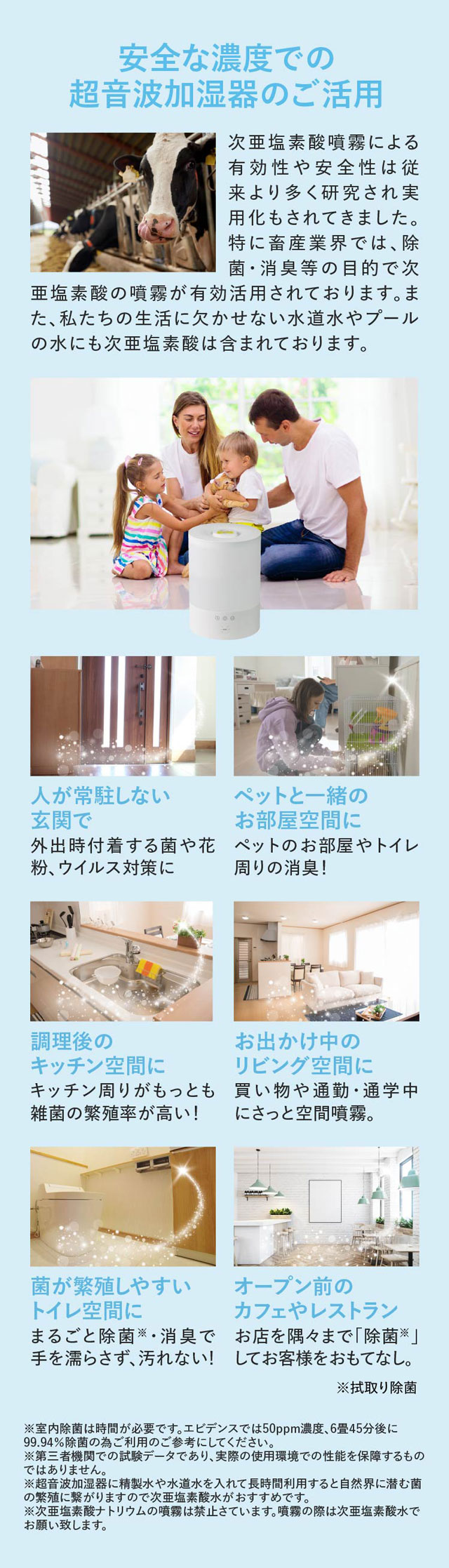 製造時は高濃度500ppm強 pH5.8の為、希釈して大容量の次亜塩素酸水としてお使い頂けます。次亜塩素酸水はアルコール耐性のあるウイルスや菌にも強く機能しますが、有機物に触れると水と約0.02%の塩に戻るため、ヒトや自然にも大変優しい除菌水です。専用超音波加湿器を利用すると室内付着菌の除菌が可能です。※99.9%除菌性能テスト済み。超音波加湿器は「人の手を介さずに付着菌を処理するという発想から生まれました」