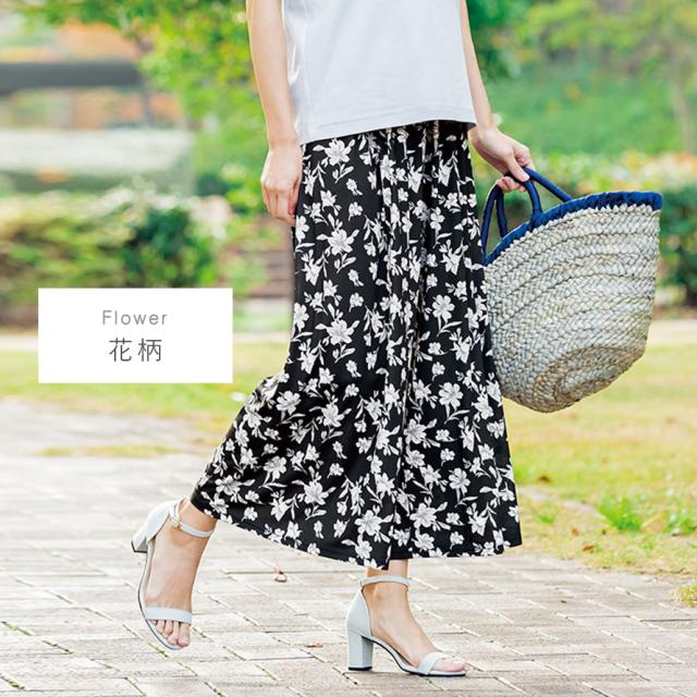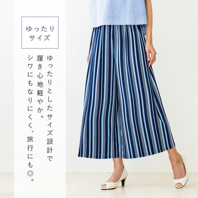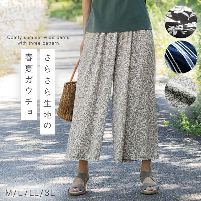 夏 涼しい ワイドパンツ,ガウチョパンツ きれいめ,ワイドパンツ ウエストゴム,ワイドパンツ,ガウチョパンツ,ワイド,ガウチョ,さらさら,サラサラ,サラっと,さらっとしている,さらり,サラリ,爽やか,さわやか,べたつかない,ベタつかない,花柄,ストライプ,ドット,ブラック,黒,ネイビー,紺,ブルー,青,パンツ,ボトムス,ボトム,ウエストゴム,総ゴム,ウエスト,ゴム,動きやすい,楽ちん,春,夏,春夏,夏用,薄手,薄い,大人,レディース,女性,お年寄り,高齢者,シニア,50代,60代,70代,おしゃれ,お洒落,オシャレ,かわいい,可愛い,シンプル,M,L,LL,3L,大きいサイズ,大きめ,ゆったり,カジュアル,きれいめ,フェミニン,上品,エレガント,高見え,体型カバー,コーディネート,着回し,細見え,着痩せ,着心地,