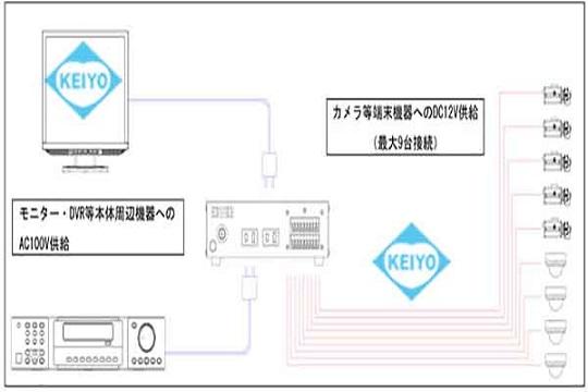 KCPS12-63(PS-1270S)は、コンセント一つで多数の機器に電源供給が可能な集中電源ボックスです。防犯カメラを複数台設置する際にKCPS12-63を使用する事によりコンセント一口で複数台に電源を供給できます。