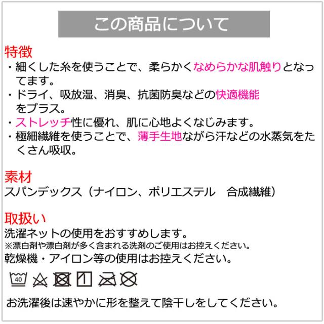 ・細くした糸を使うことで、柔らかくなめらかな肌触りとなってます。 ・ドライ、吸放湿、消臭、抗菌防臭などの快適機能をプラス。 ・ストレッチ性に優れ、肌に心地よくなじみます。 ・極細繊維を使うことで、薄手生地ながら汗などの水蒸気をたくさん吸収。 素材 スパンデックス(ナイロン、ポリウレタン 合成繊維) 取扱い 洗濯機・ネット使用 |