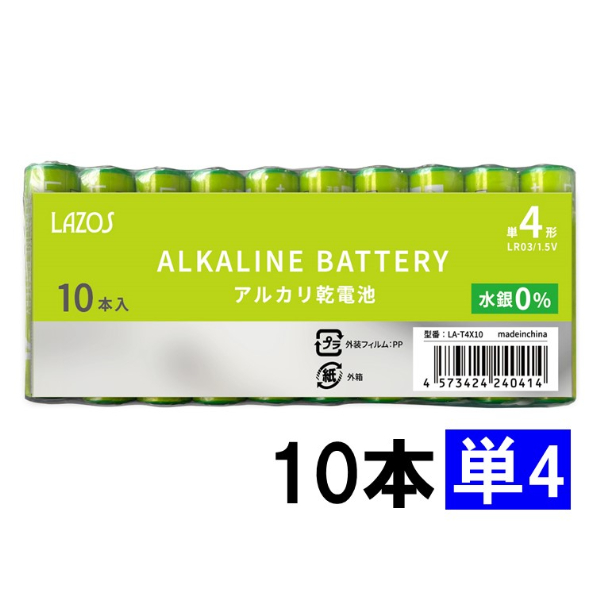 10本 単4 アルカリ電池 乾電池 LAZOS製 LA-T4X10 ネコポス送料無料