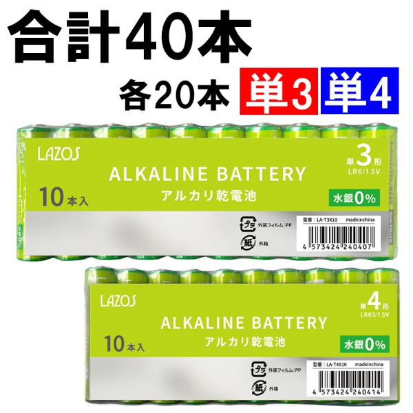 単3/単4 40本(各20本) アルカリ電池 乾電池 便利なセット LAZOS製 ネコポス送料無料