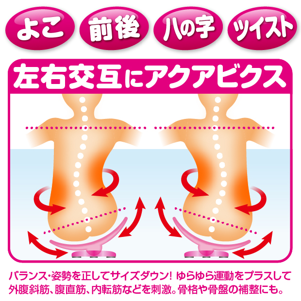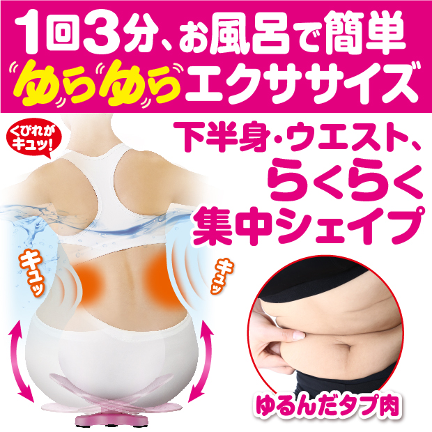 1回3分、入浴時「ゆらゆら〜ん」に座ってゆらゆら運動をするだけで、たるみの気になるお腹周り、骨盤周りの筋肉を刺激しシェイプ。おうちにいながらアクアビクス体験。お風呂の中ではなかなか出来ない『たて』・『よこ』・『八の字』・『ツイスト』運動が出来る優れもの。お風呂の中の「浮力」「抵抗」「水圧」の3つのチカラを借りて、身体に余分な負担をかけず、またお風呂の『水温』でポカポカと体の芯まで温めながら効率よく運動が出来ます。1回3分で十分なので、運動嫌いの人でも簡単・手軽にはじめられます。
