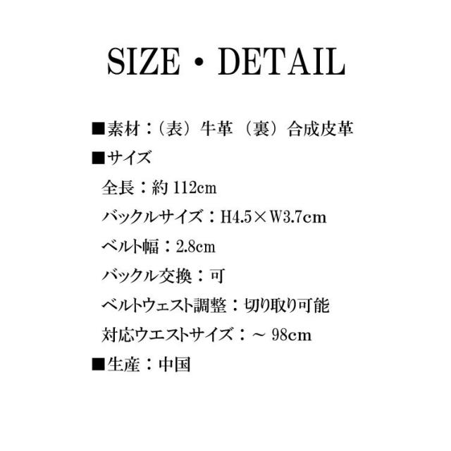 kansaiのベルトがこの価格で登場! ■ITEM INFO■ kansaiのベルトがこの価格で登場! ブラック、チョコの2色展開です。 表面はツヤのあるスムースタイプです。裏は合成皮革を使用して耐水性を高めています。 バックルはシンプルで、シルバーが映えます。 薄めのベルトでビジネス向けにピッタリの仕様です。 長さ調節可能で、ウェスト98.0cmまで対応可能です。 − DETAIL − ■長さ:全長112cm(対応ウエストサイズ〜98.0cm) ■重量: 120g ■ベルト幅:2.8cm ■厚み:0.4cm ■素材:(表)牛革 (裏)合成皮革 ■その他:バックル交換可能、長さ調整切り取り可能、ウエスト最大〜98cm ■生産国:中国 【サイズ表記について】 ベルト長さ:約112cm (バックル先端から剣先までの長さ) ウエストサイズ:最大98cm(ピンの根元から最後のピン穴までの長さ) ピン穴:5つ ピン穴間隔:2cm バックルサイズ:4.5cm×3.7cm |