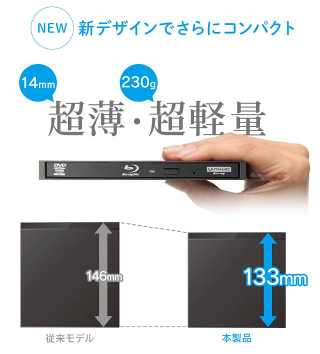 〇薄さ14mm、重さ230gの「超薄型・超軽量」ポータブルブルーレイドライブ。