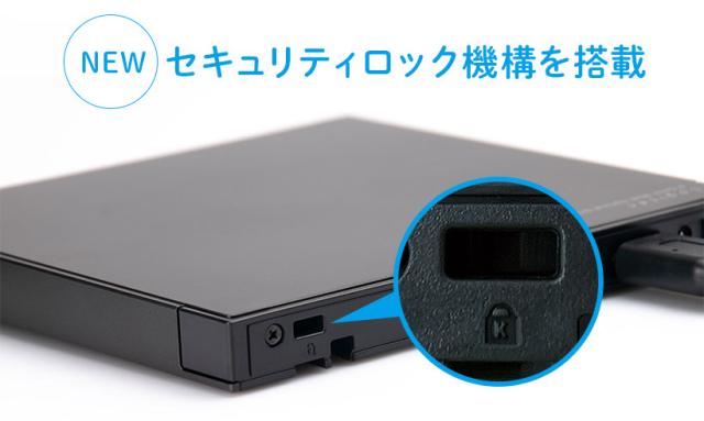 盗難防止のためのセキュリティロック機構として、ケンジントンロックのスリットを製品背面に設置しています。机などにドライブを固定することができるので、外出先での利用時や、ドライブを共有する際などでの盗難を防止します。