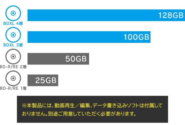 BDXLの書込み、ディスクイメージの作成、音楽CDの作成、ディスク消去などが可能です。BDXLでは128GBのデータ保存ができますので、大容量の動画データやデジカメのRAWデータ、デザインデータなどの保存に便利です。またBDXL対応のレコーダーで録画した番組をBDXLに書き出せば、本製品を接続したパソコンでも動画を視聴できます。
