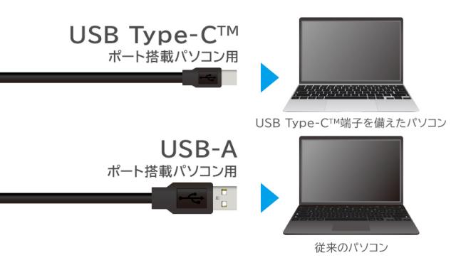 USB-A/USB Type-C(TM)の2種類のUSBケーブルを付属