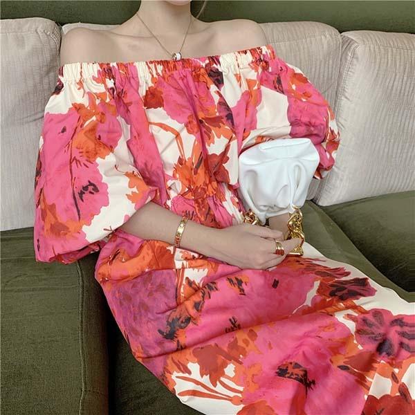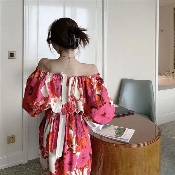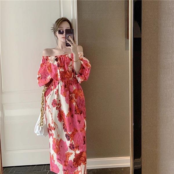 マキシ丈 オフショル ワンピース 夏 ハワイアン 袖あり バックスリット セクシー ウエストゴム 大花柄 リゾートワンピ オフショルダー 背中開き アロハ ワンピース エスニック プリント 半袖 ロングワンピース S/M/L/XL dd083x1x1s3
