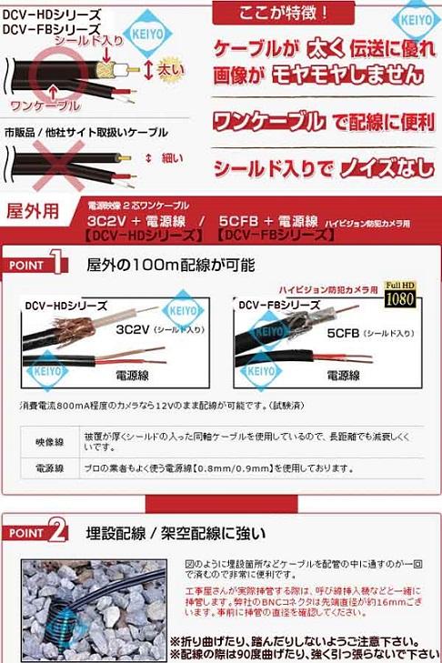 ハイビジョン方式のカメラに、従来のアナログカメラ用ケーブルを 使用すると、信号伝送ができなかったり、ノイズ等の原因になります。 高画質映像を伝送するために、本シリーズをご利用下さい。