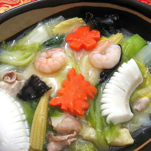 白菜、チンゲン菜、人参、ニンニク、ヤングコーン、竹の子、海老、イカ、マッシュルーム、生姜、胡椒、澱粉、塩澱粉、カキ油、ごま油、植物油、調味料(アミノ酸等)、小麦粉、砂糖、醤油(大豆、小麦を含む)