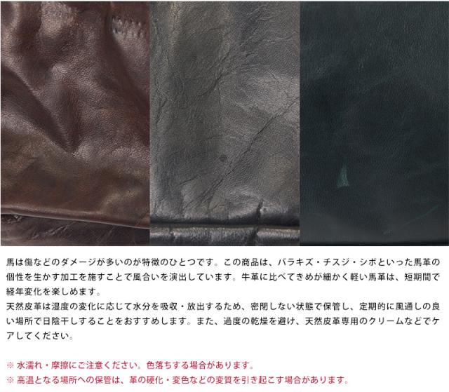 ・馬は傷などのダメージが多いのが特徴の一つです。 この商品は、バラキズ・チスジ・シボといった馬革の個性を生かす加工を施すことで風合いを演出しています。 牛革に比べてきめが細かく軽い馬革は、短期間で経年変化を楽しめます。