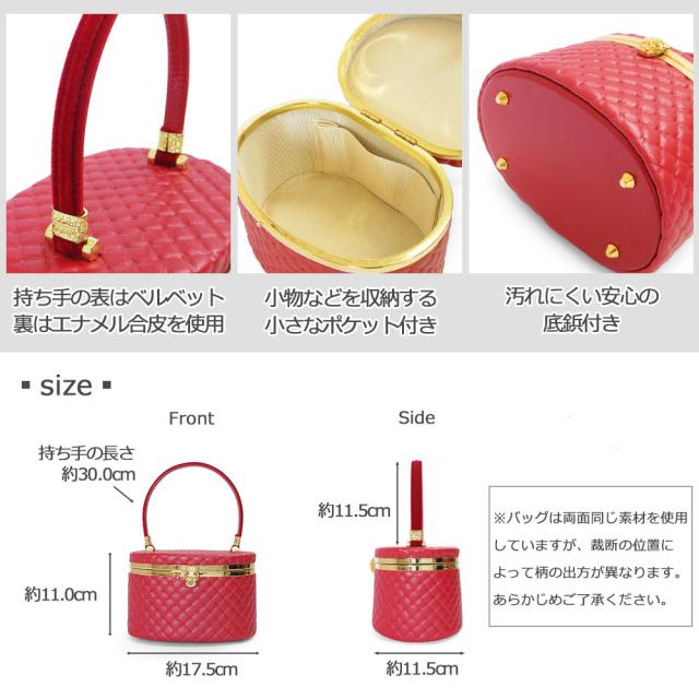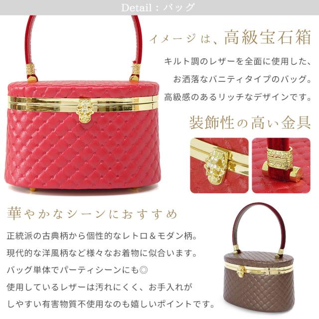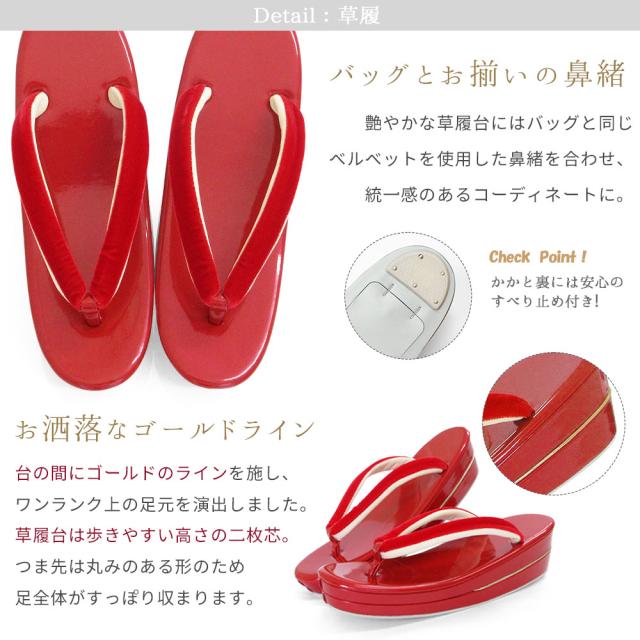 バッグの持ち手部分と草履の鼻緒には肌触りの良いベルベットを使用しています。
