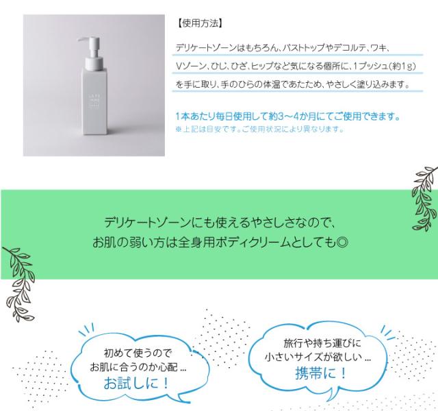 デリケートゾーンはもちろん、*気になる個所 に1プッシュ( 約1g) を 手に取り、手のひらの体温であたため、やさしく塗り込みます。