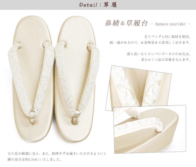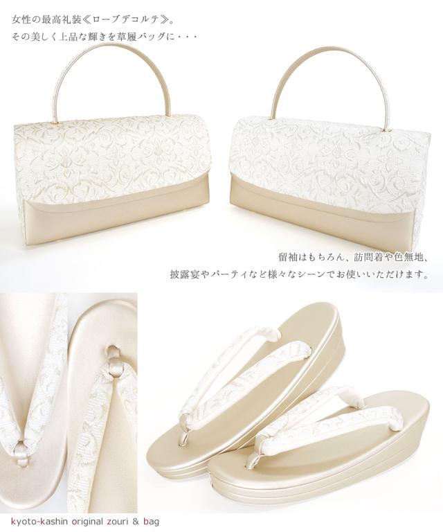 女性の最高礼装≪ローブデコルテ≫をもとに、どんなシーンでもお使いいただける上品な草履とバッグに仕上げました。