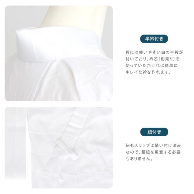 腰紐縫い付け済みのスリップタイプなので、これ一枚ですぐに着物や浴衣を着ていただけます。