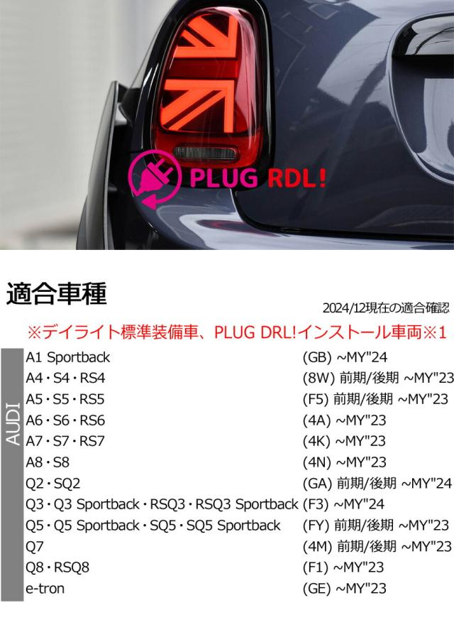 ![]() ![]() ![]() ![]() リアデイライトを有効にすることでテールランプとナンバー灯が点灯します。※1 日中にテールランプが点灯することで、視認性の向上により安全性が高まるだけでなく、最新のledテールデザインを際立たせスタイリッシュなリアビューを演出します。 技術的な作業は一切必要無く、obd2 診断ポートに挿し込み内蔵ledインジケーターによりインストール/アンインストールを誰にでも判りやすく簡単に出来ることを可能とした画期的な製品です。 本体ケースの内部にdip スイッチを内蔵し安心のリカバリーモード搭載。 万が一の際に本製品を挿す前の車両の状態に戻す事が出来ます。 ![]() --------------------------------------- <適合> AUDIアウディ ※デイライト標準装備車、PLUG DRL!インストール車両※1 ・A1 Sportback (GB) ~MY"24 ・A4・S4・RS4 (8W) 前期/後期 ~MY"23 ・A5・S5・RS5 (F5) 前期/後期 ~MY"23 ・A6・S6・RS6 (4A) ~MY"23 ・A7・S7・RS7 (4K) ~MY"23 ・A8・S8 (4N) ~MY"23 ・Q2・SQ2 (GA) 前期/後期 ~MY"24 ・Q3・Q3 Sportback・RSQ3・RSQ3 Sportback(F3) ~MY"24 ・Q5・Q5 Sportback・SQ5・SQ5 Sportback (FY) 前期/後期 ~MY"23 ・Q7 (4M) 前期/後期 ~MY"23 ・Q8・RSQ8 (F1) ~MY"23 ・e-tron(GE) ~MY"23 --------------------------------------- ※リカバリーモードについて: 本製品をインストールする前の車両状態に戻す事が出来る機能です。 ※1 日中でもテールランプ、ナンバー灯およびインテリアライトが点灯いたします。ナビゲーションモニターの明るさは暗くなりません。 ※3 デイライト非標準装備車は予めPLUG DRL!をインストールしてください。リアデイライトを任意でON/OFFを行いたい場合は、PLUG DRL!/PLUG DRC!をインストールすることでデイライト項目が追加され、ON/OFFが可能となります。 ●本製品は車両の車体番号にて管理しています。別の車両には使用出来ません。 ●本製品を購入後1年以内に車両ソフトウェアがバージョンアップした場合、対応出来次第無償にて製品のソフトウエアをアップデートさせていただきます。尚、ソフトウェアのアップデートサービスが終了した製品につきましては購入後1年以内でも保障対象外とさせていただきます。 ※本製品の適合している車両でも、予告なく変更された車両仕様により本製品をインストールができない場合があります。それに伴う発生した工賃・部品などの費用はお客様のご負担となります。 ●本製品はコーディング変更や他社の製品による同等の変更に対して使用すると、正常にインストール出来ない場合がありますので併用しないでください。保証対象外となります。 ●製品はご購入日より1年保証となります。 ![]() ![]() |