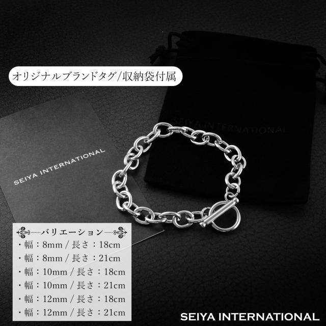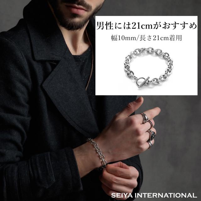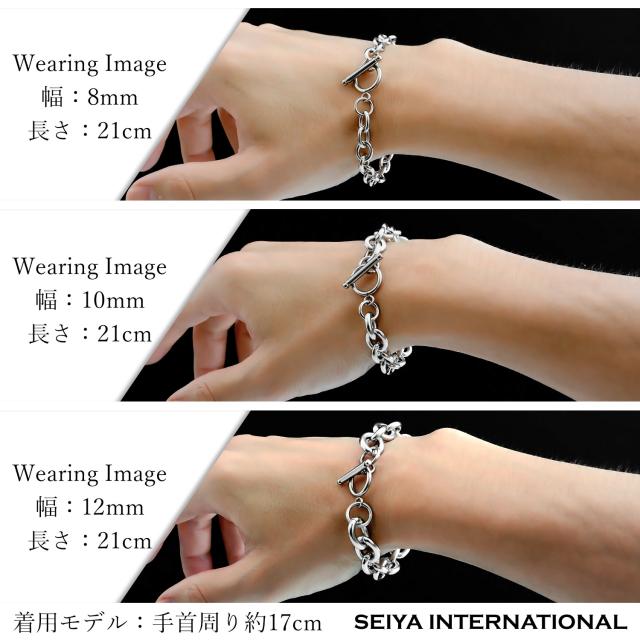 チェーン幅8mm、10mm、12mm、チェーンの長さ18cm、21cmのそれぞれ計6種類ご用意しております。一般的な男性の手首周りのサイズは平均17センチ、女性は平均15センチで、チェーンブレスレットの場合は、手首周りプラス2〜4センチぐらいがぴったり過ぎず、ちょうどいいサイズと言われています。