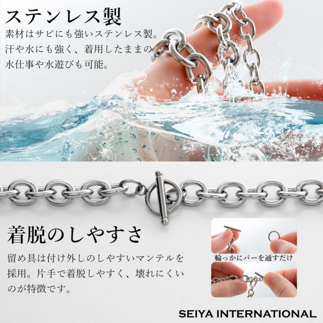 太幅 小豆チェーンに留め具をマンテルにしたデザインで材質はステンレスになります。ステンレスは金属の中でもアレルギー性が極めて低い素材です。耐食性がとても高いので水や汗によるサビ、変色に強いのでお風呂や海へ気にせずアクセサリーを着けたまま入ることができます。また、硬い金属なので傷がつきにくく、変形しにくいです。水にぬれた時も乾いたタオルでさっと拭くだけでお手入れも簡単です。