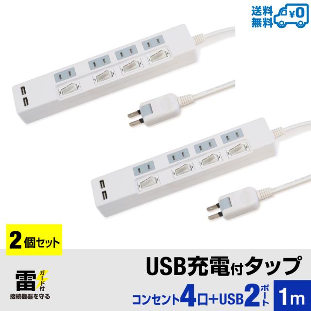 【2個セット・1個当たり1,849円・送料無料】STYLED USB充電付電源タップ コンセント×4口 USB×2ポート 合計2.4A 電源コード1m 18ヵ月保証 雷ガード 個別スイッチ スイングプラグ シャッター付コンセント iPhone iPad スマホ OAタップ 延長コード ホワイト STP4UA2W-1X2