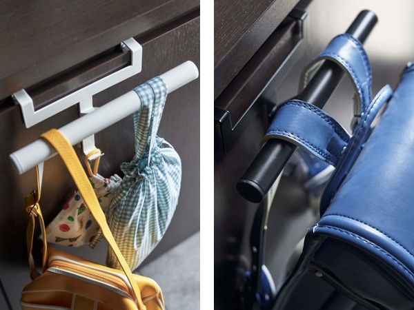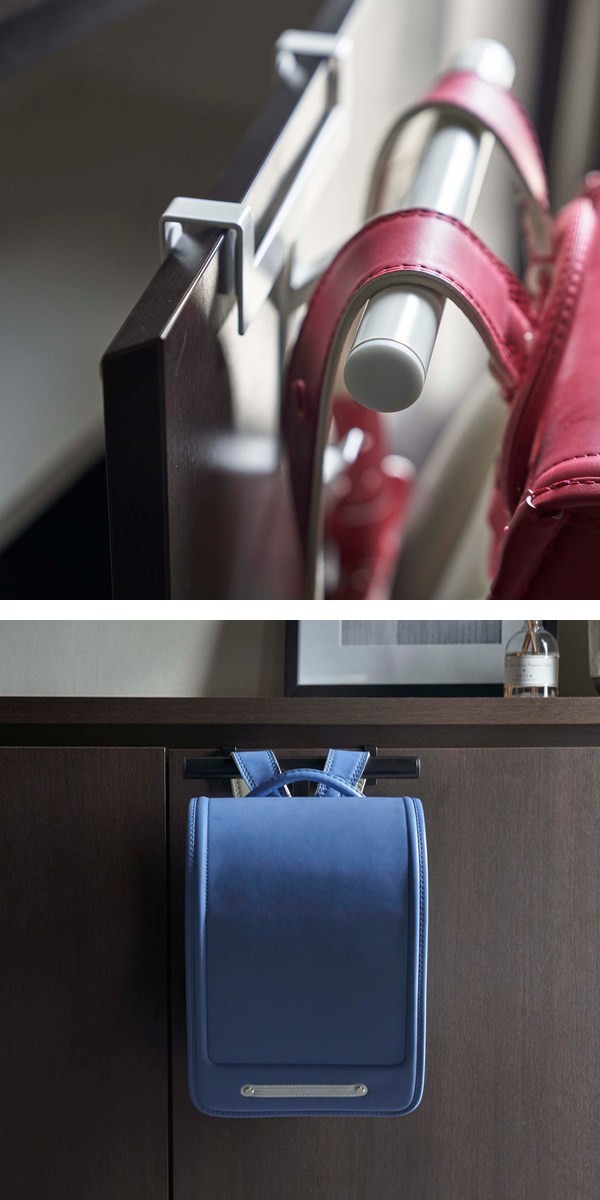 玄関の下駄箱収納扉・引き出し・ドアなどに取り付けて頂く事のできるランドセルハンガーです。工具不要で、取り付け場所に差し込むだけで簡単に設置できます。