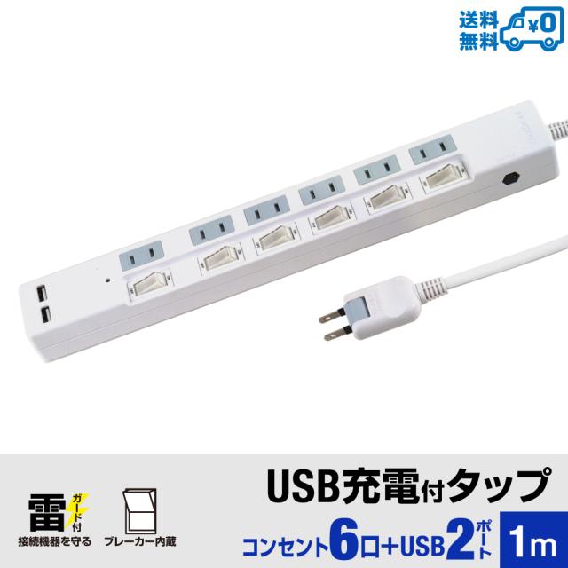 【送料無料】STYLED USB充電付電源タップ コンセント×6口 USB×2ポート 合計3.4A 電源コード1m 18ヵ月保証 雷ガード ブレーカー 個別スイッチ スイングプラグ シャッター付コンセント iPhone iPad スマホ OAタップ 延長コード ホワイト STP6UA2W-1