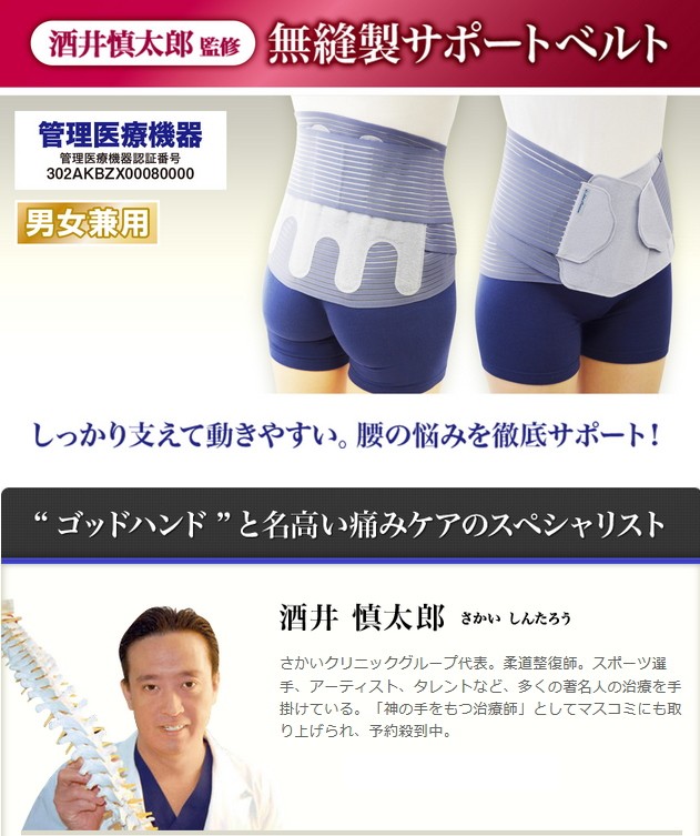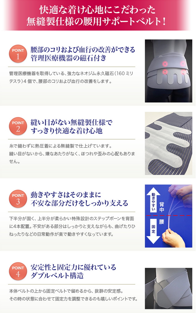 酒井慎太郎先生監修の「無縫製サポートベルト」。伸縮性・耐久性ベルトが腰全体を優しく、しなやかに、しっかり包み込むサポーターになります。背筋がスッキリ伸びる心地良い安定感、快適なフィット感を実感できます。背面には特殊形状のステップボーン配置。動きやすい上部から固定力に優れた下部へと段階的に保持力を変化させ、腰を適切に保持、「広背筋」「脊柱起立筋」をしっかりサポートします。強力なネオジム永久磁石を配置することで腰部の血行を促進させ、コリを緩和します。薄型なのでアウターに響かず、無縫製なのでほつれ歪みの心配がなく付け心地抜群です。
