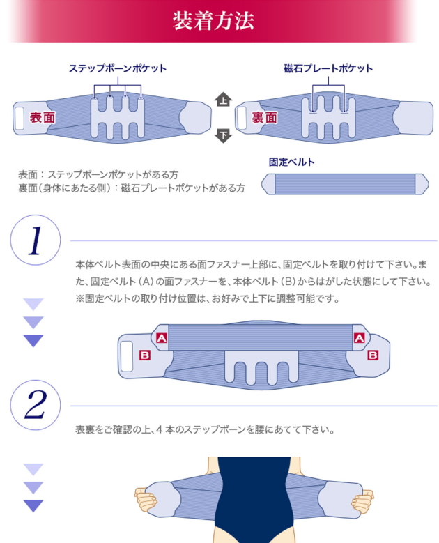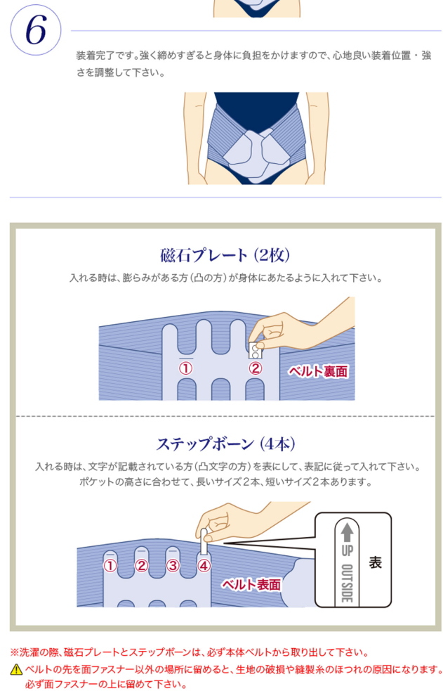 【セット内容】本体ベルト、固定ベルト、取扱説明書【サイズ】●適応サイズ(ウエスト)/S〜M:58〜76cm、L〜LL:76〜105cm、3L〜4L:105〜135cm●本体ベルト/製品幅:26cm ±1cm、S〜M:90cm、L〜LL:105cm、3L〜4L:120cm【重量】約288g ※S〜Mの場合(固定ベルト装着時)【素材】●本体ベルト/ポリエステル、ポリウレタン、ナイロン(ゴム糸使用)●固定ベルト/ポリエステル、ポリウレタン、ナイロン(ゴム糸使用)●永久磁石/ネオジム磁石(ニッケルメッキ仕上げ)●ステップボーン/ポリプロピレン【最大磁束密度】160mT±25%【管理医療機器認証番号】302AKBZX00080000【区分】日本製・医療機器【製造販売元】目黒精工株式会社【メーカー】株式会社ヴァルテックス