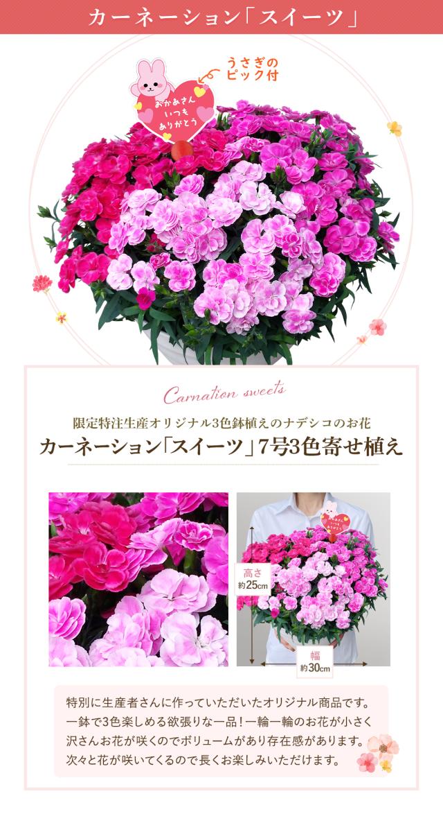 4種から選べるカーネーション7号鉢、お母さんありがとうウサギさんピック、母の日メッセージ入りお手入れガイド
