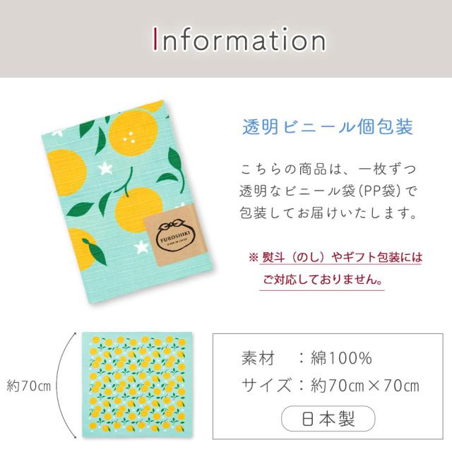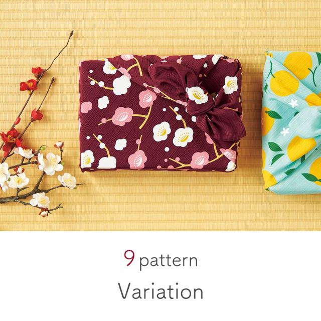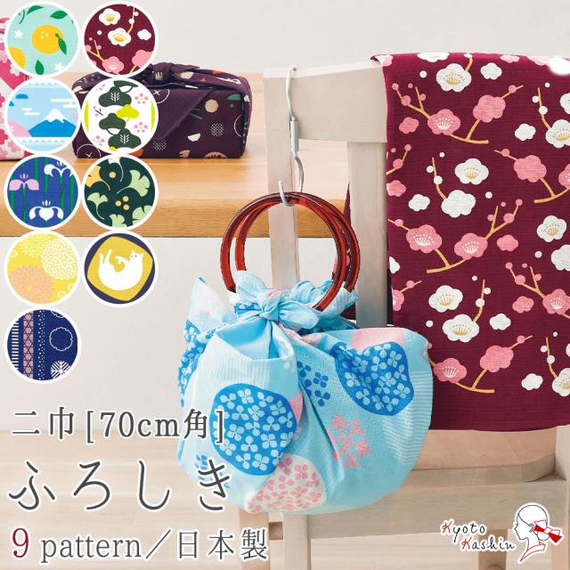 菓子折りや重箱・ワインボトルなどのラッピングにも使いやすい、一般的な二巾(約70cm×70cm)サイズの風呂敷です。