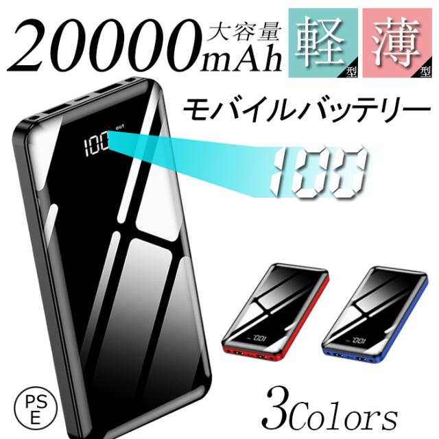モバイルバッテリー 小型コバッテリー大容量20000mAh軽量 薄型携帯充電器 2台同時充電充電 LEDライト付き PSE認証済
