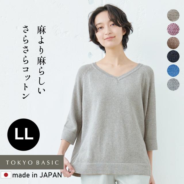 大きいサイズ 綿ニット コットンニット ギマコットン100% Vネック プルオーバー LL 2L XL日本製 大人服 ニット 7分袖 七分袖 コットン 擬麻コットン さらさら