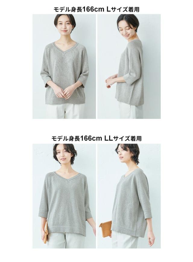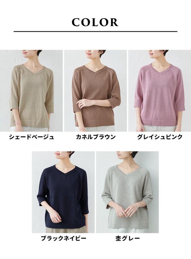特徴 サラサラで春・夏・秋と着回せるギマニット。シンプルなデザインだから合わすアイテムを選ばず、長いシーズン着回せる。Vネックでシャープに。程よい開きだから、一枚で着られる。ラグラン袖で着心地楽ちん。ニットならではの減らし目が上品な印象。抜け感を出してくれる七分袖で長いシーズン着回すことができます。袖と裾はリブではなく、袋(2枚仕立て)にする事でカジュアル過ぎず、上品な印象になりました。