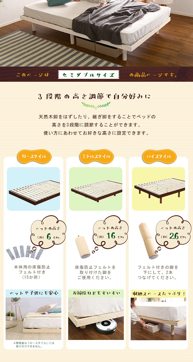 ミニ棚付き すのこベッド フレーム セミダブル 送料無料 高さ調整 高さ調節 北欧 パイン 頑丈 ヘッドレス 簡易 宮付き ステージ 木製 おしゃれ 天然木 ロータイプ ハイタイプ 脚付き 継ぎ脚 ローベッド マットレスなし