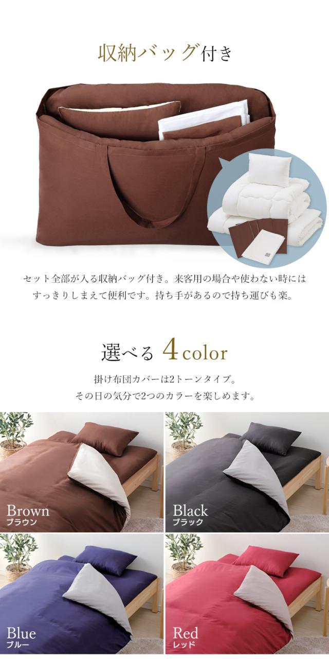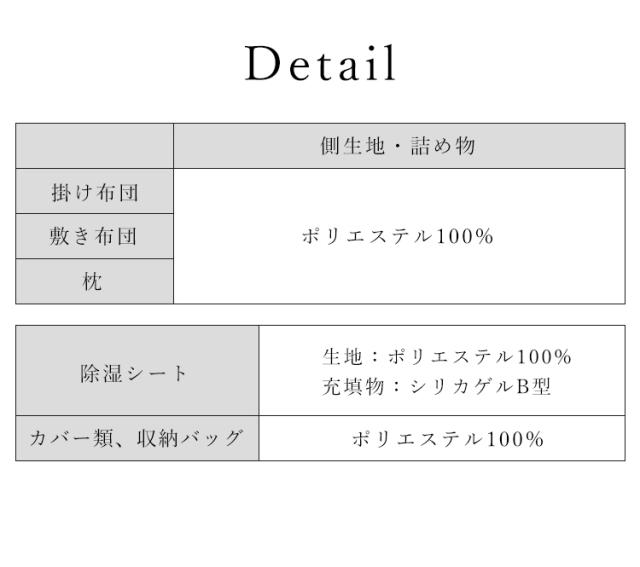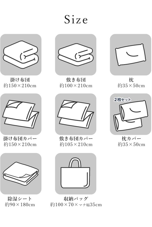 掛け布団、敷き布団、枕、掛け布団カバー、敷き布団カバー、枕カバー×2、除湿シート、収納バッグ