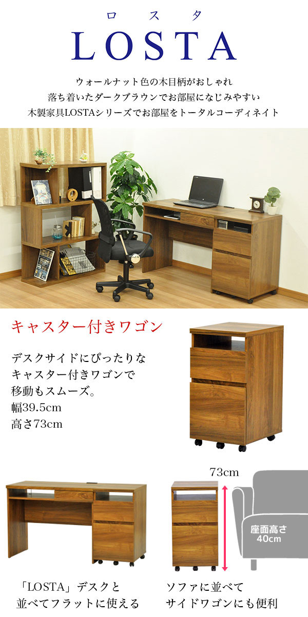 デスクワゴン A4ファイル対応 サイドワゴン デスクサイドワゴン ウォールナット柄の木目シート 幅39.5cm 奥行47cm 高さ73cm 北欧風ナチュラルカントリー調 オフィスワゴン リビング収納 ブラウン(茶色) シンプル 一人暮らし ファミリー おしゃれ LST-7040W