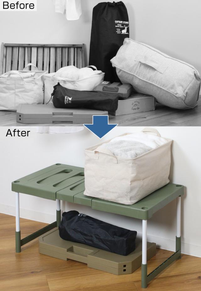 家だけでなく、車の中でも使える伸縮ラックは、かさばるキャンプ用品やスポーツ用品、お子様のスポ少引率の際の荷物などの収納に最適です。ラックを使うことで荷物が重なりすぎずにスッキリ収納することができ、現地に到着してからもサッと取り出せて、運び出しもスムーズに行えます。