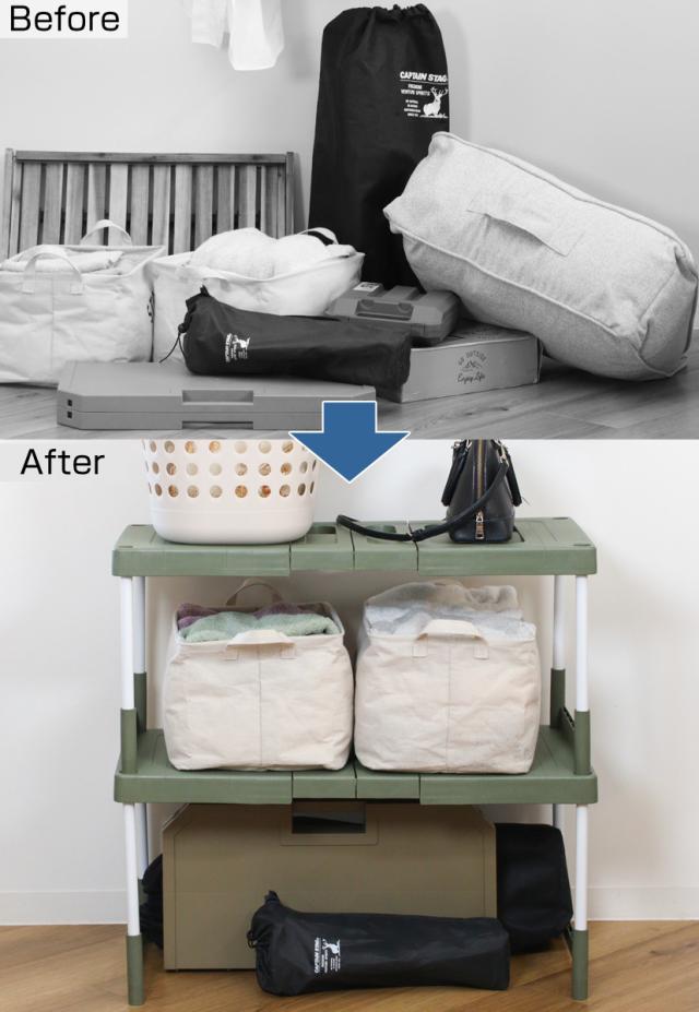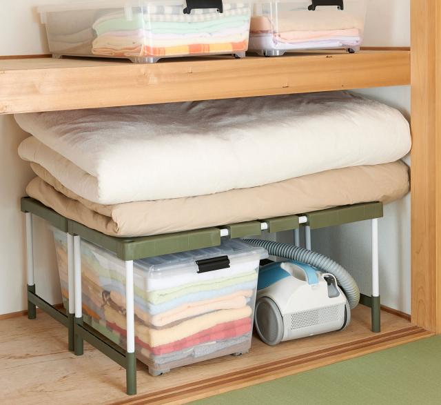 奥行きのある押入れにはラックを前後に2台並べて使うと、収納場所をとる布団も気持ちよく収納できます。布団をラックに置くことで、布団下に生まれた新たな収納スペースに、衣装ケースなど今まで置けなかった収納ケースをプラスして、押入れの中をすっきり整理しましょう。