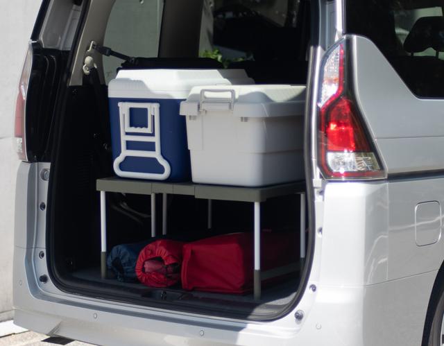 家だけでなく、車の中でも使える伸縮ラックは、かさばるキャンプ用品やスポーツ用品、お子様のスポ少引率の際の荷物などの収納に最適です。ラックを使うことで荷物が重なりすぎずにスッキリ収納することができ、現地に到着してからもサッと取り出せて、運び出しもスムーズに行えます。