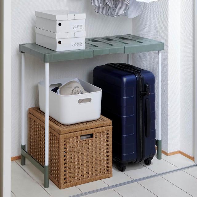 クローゼットや押入れの余っているタテの空間を、上下に分割して無駄なく有効活用できるフリーラックです。幅は伸縮可能で、収納する場所やデッドスペースに合わせてお使いいただけます。