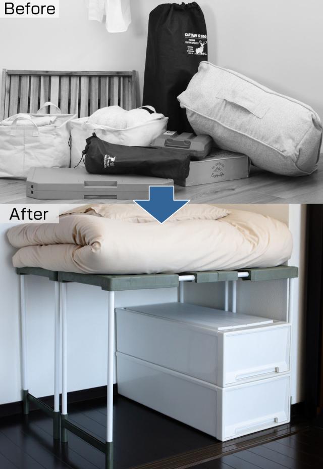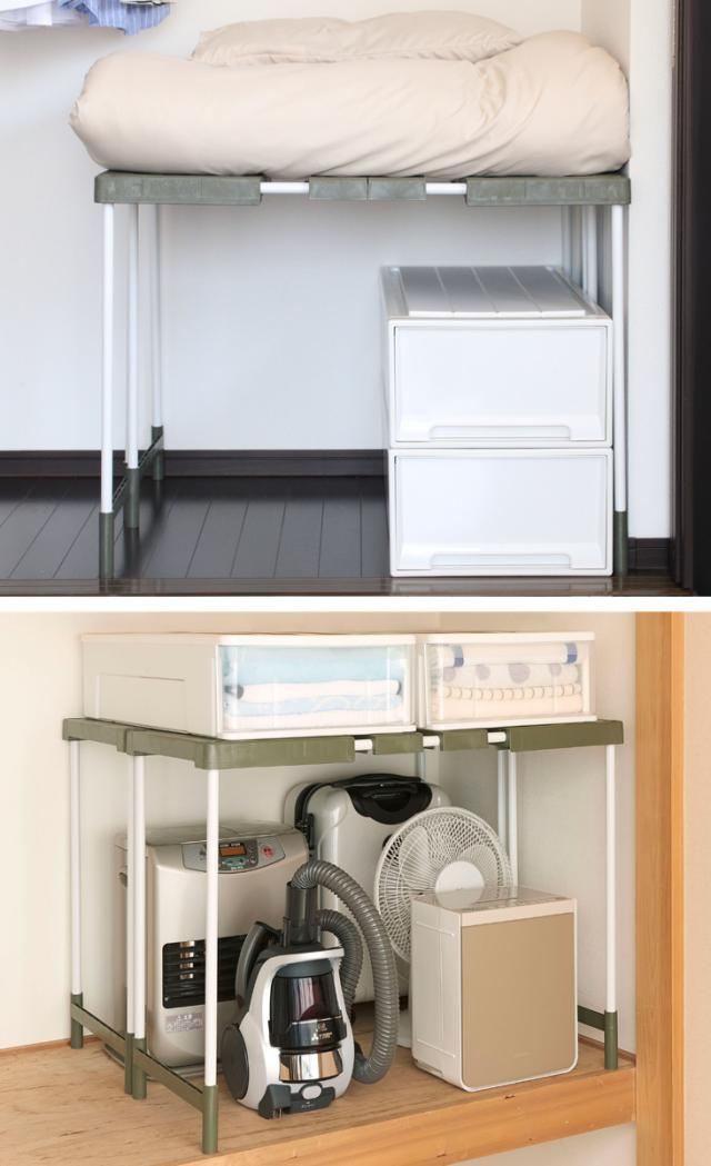 奥行きのある押入れにはラックを前後に2台並べて使うと、収納場所をとる布団も気持ちよく収納できます。布団をラックに置くことで、布団下に生まれた新たな収納スペースに、衣装ケースやトランクケース、扇風機やストーブなどの高さがあってかさばる季節物もスッキリ収納できます。