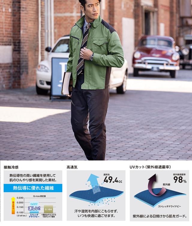 ◎機能:帯電防止素材使用、ストレッチ、反射、接触冷感、樹脂穴ボタン、UVカット、腰裏付(シルバーのみ)