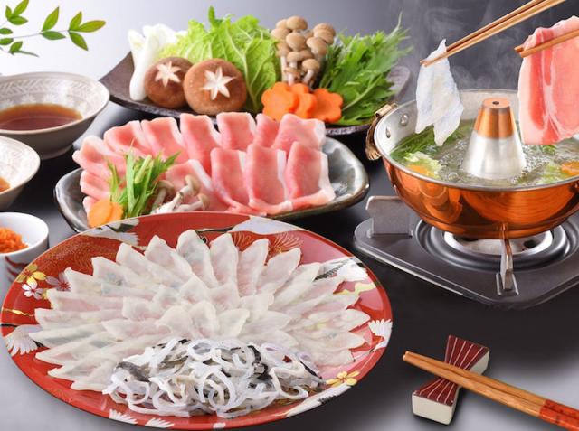 国産真ふくと鹿児島県産黒豚それぞれの旨味をしゃぶしゃぶで贅沢にお楽しみください。真ふくはお刺身としてそのままお召し上がりいただけます。