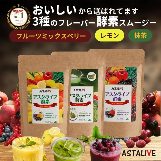 ASTALIVE酵素スムージーのフルーツミックスベリー味、レモン味、抹茶味のフレーバー全3種類から1つを選択できます!