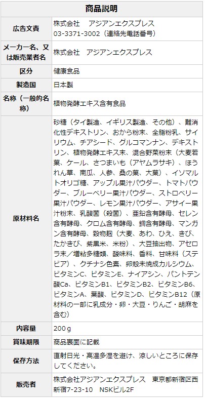 【原材料】 砂糖(タイ製造、イギリス製造、その他)、難消化性デキストリン、おから粉末、全脂粉乳、サイリウム、チアシード、グルコマンナン、デキストリン、植物発酵エキス末、混合野菜粉末(大麦若葉、ケール、さつまいも(アヤムラサキ)、ほうれん草、南瓜、人参、桑の葉、大葉)、イソマルトオリゴ糖、アップル果汁パウダー、トマトパウダー、ブルーベリー果汁パウダー、ストロベリー果汁パウダー、レモン果汁パウダー、アサイー果汁粉末、乳酸菌(殺菌)、亜鉛含有酵母、セレン含有酵母、クロム含有酵母、銅含有酵母、マンガン含有酵母、穀物麹(大麦、あわ、ひえ、きび、たかきび、紫黒米、米粉)、大豆抽出物、アセロラ末/増粘多糖類、酸味料、香料、甘味料(ステビア)、クチナシ色素、卵殻未焼成カルシウム、ビタミンC、ビタミンE、ナイアシン、パントテン酸Ca、ビタミンB1、ビタミンB2、ビタミンB6、ビタミンA、葉酸、ビタミンD、ビタミンB12(原材料の一部に乳成分・卵・大豆・りんご・胡麻を含む)