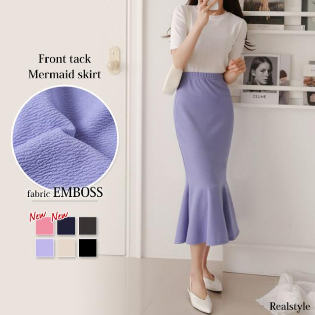 エンボス加工フロントタックロング丈マーメイドスカート レディース ボトムス 春 ミモレ丈 通勤 伸縮性 リラックス 無地 ベーシック シンプル ウエストゴム きれいめ カジュアル かわいい OL オフィス 上品 メール便 wfp02564
