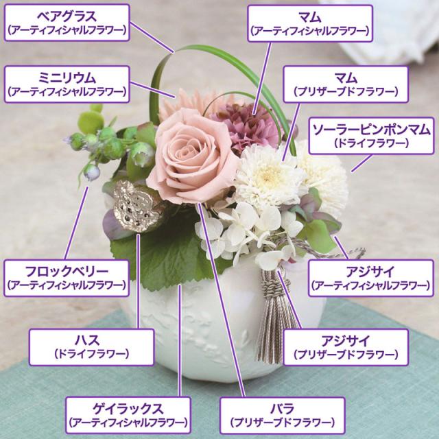 | 花材 | プリザーブドフラワー:バラ、アジサイ、菊 ドライフラワー:ハス、ピンポンマム アートフラワー:マム、アジサイ、ベリー、葉物 |