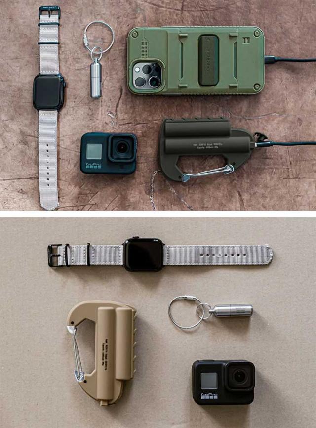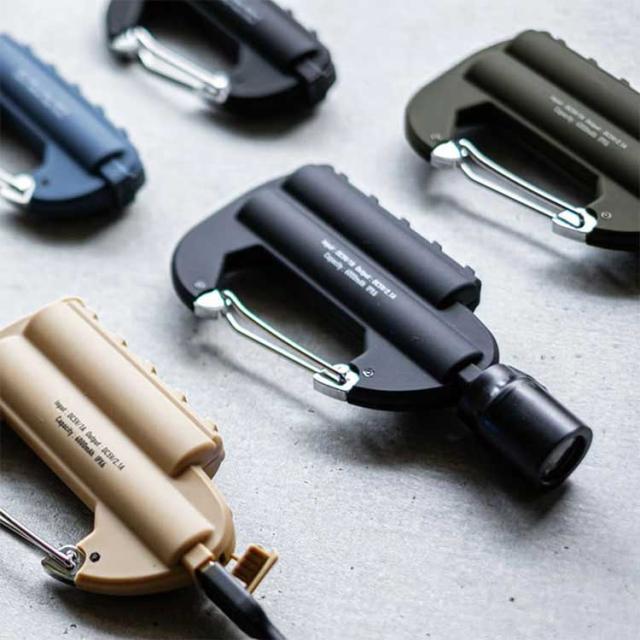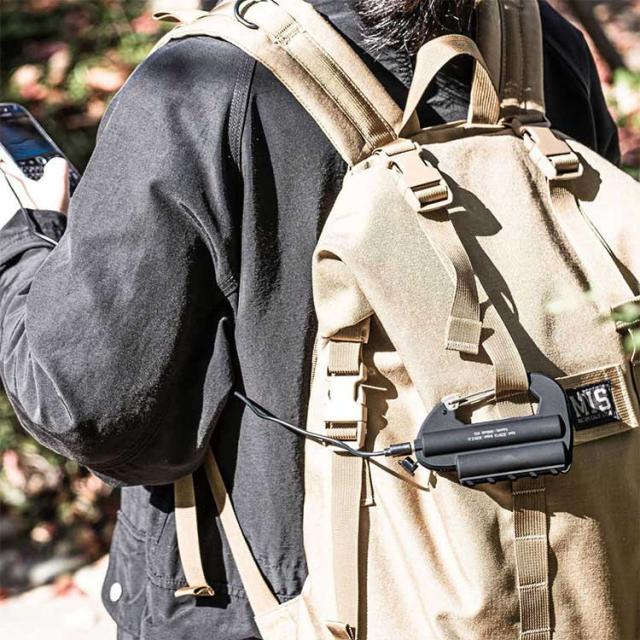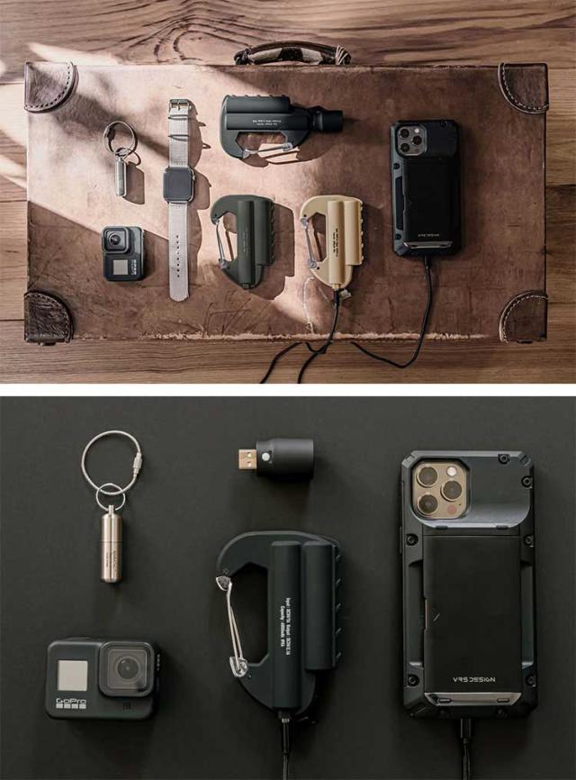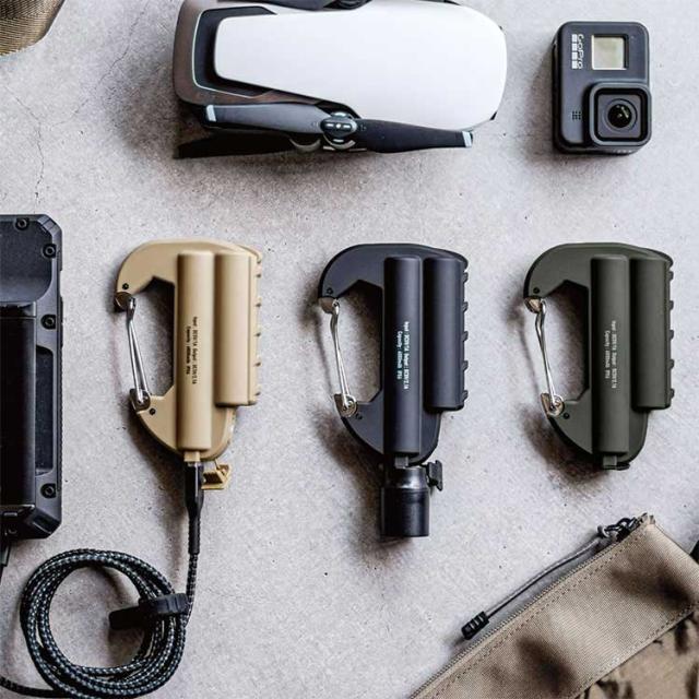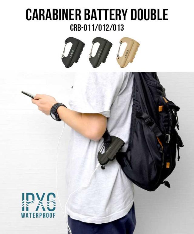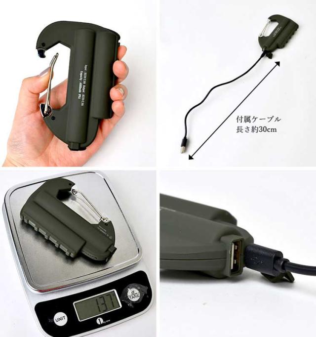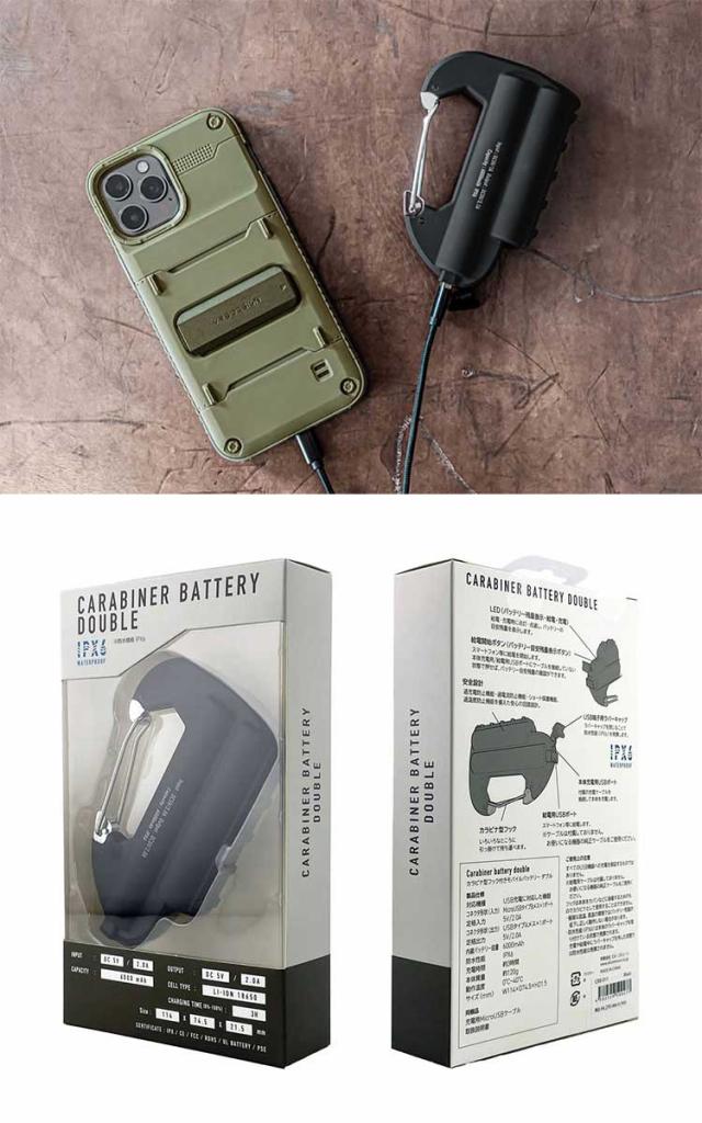 リュックの金具等に引っ掛けられるカラビナ型のバッテリー。