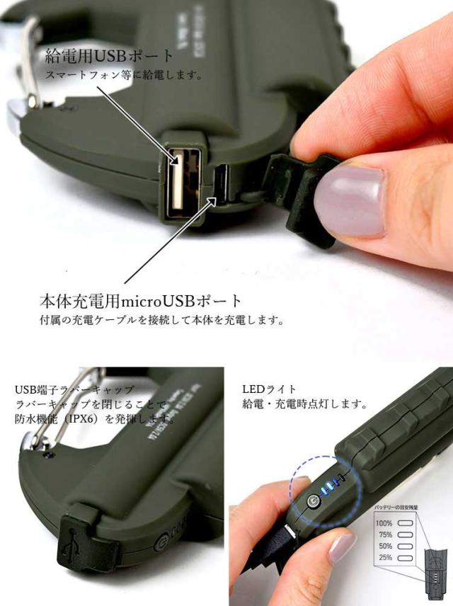 | 備考 | すべてのUSB機器への充電を保証するものではありません。 フックは本体をカバンなどに装着するためのものです。登山、安全装置等の用途で使用する事は出来ません。 極端な低温、高温の環境ではバッテリー性能が低下し正しく動作しない場合があります。 防水性能(IPX6)は本体のラバーキャップを取り付けている状態で発揮されます。 充電や給電中にラバーキャップを外した状態では防水機能は発揮されません。 *カラビナバッテリー本体には「USB LED LIGHT」は付属しておりません。 |